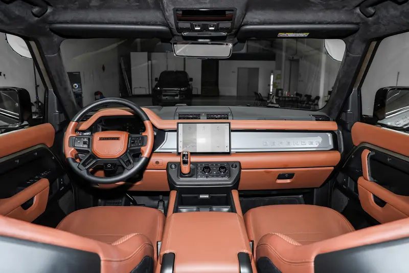 内饰延续现款路虎卫士设计风格,但在用料和工艺上进行了全面升级,采用了Ultrafabrics PU材料座椅,采用针织织物和无缝表面处理,拥有卡其色和黑檀木色两种颜色。标准内饰是全新深褐色半苯胺皮革,配以黑檀木色KvadratTM织物饰条。同时,新车部分内饰细节处带有专属OCTA标志,彰显其旗舰车型的独特身份。