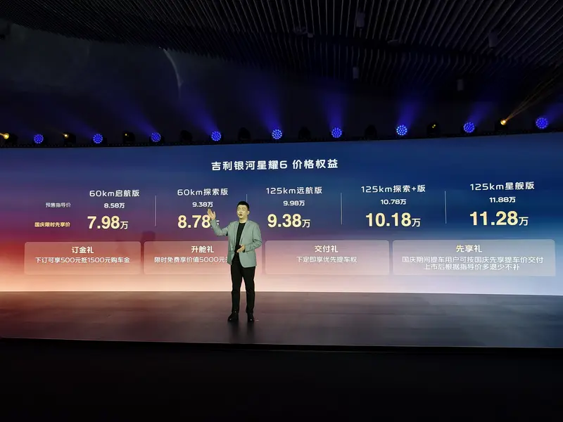 凡在预售期下订吉利银河星耀 6 的用户,均可享 500 元抵 1500 元购车金、限时免费享价值 5000 元配置升级、优先提车权等丰厚权益。考虑到国庆假期将至,为满足用户早日提车出游的心愿,吉利银河星耀6特别推出“国庆先享权益”:即日起至国庆前成功下订,即可尊享国庆先享提车价7.98万元起,并享受国庆前优先提车权益。据悉,吉利银河星耀6将于10月正式上市。