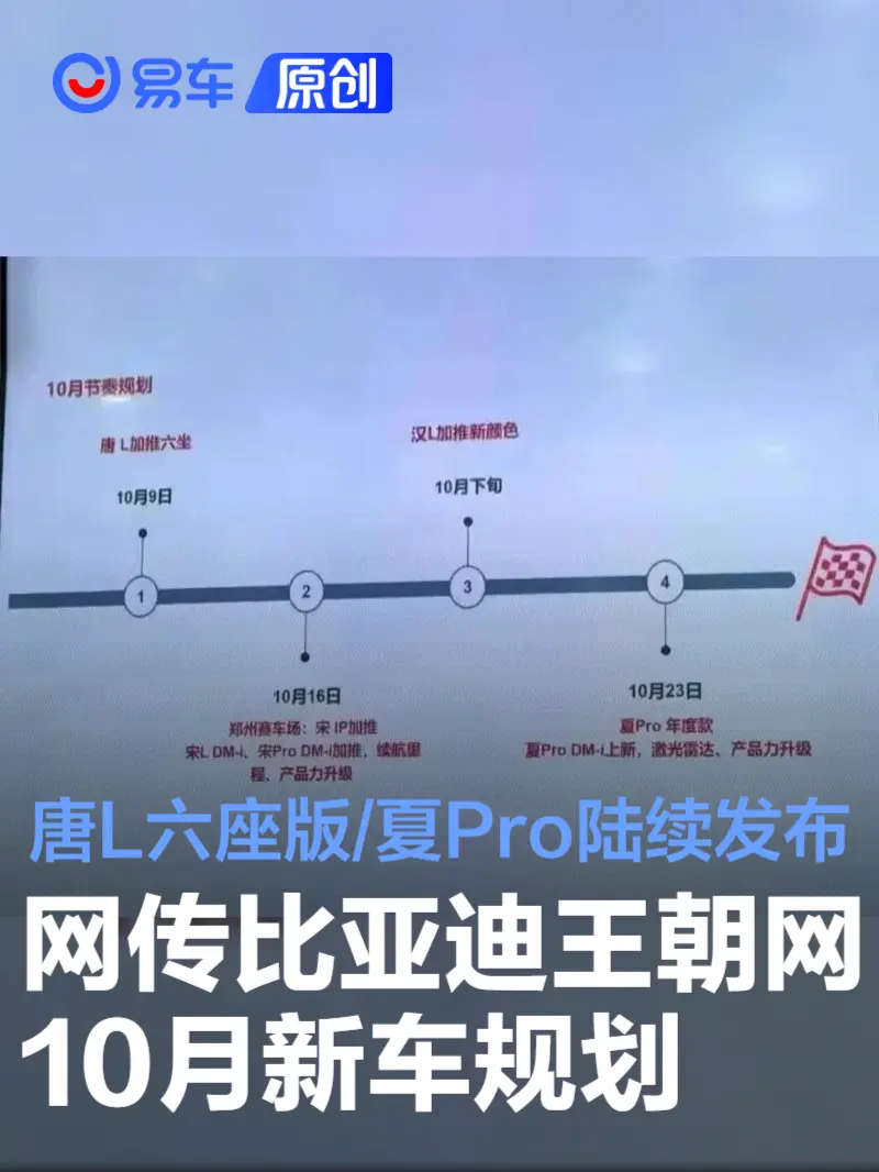 易车讯 日前,有媒体曝光了比亚迪王朝网10月新车规划,唐L将推出六座版,宋L DM-i和宋Pro DM-i将加推新版本,汉L加推新颜色,夏Pro将迎来年度改款,汉也将加推新车型。