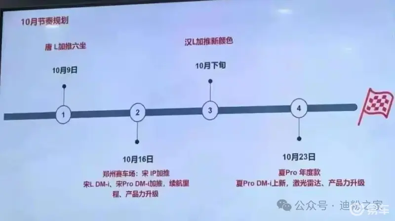 在10月下旬,汉L将加推新颜色;夏Pro将迎来年度改款车型,夏Pro DM-i将配备激光雷达,配置也会有所升级。