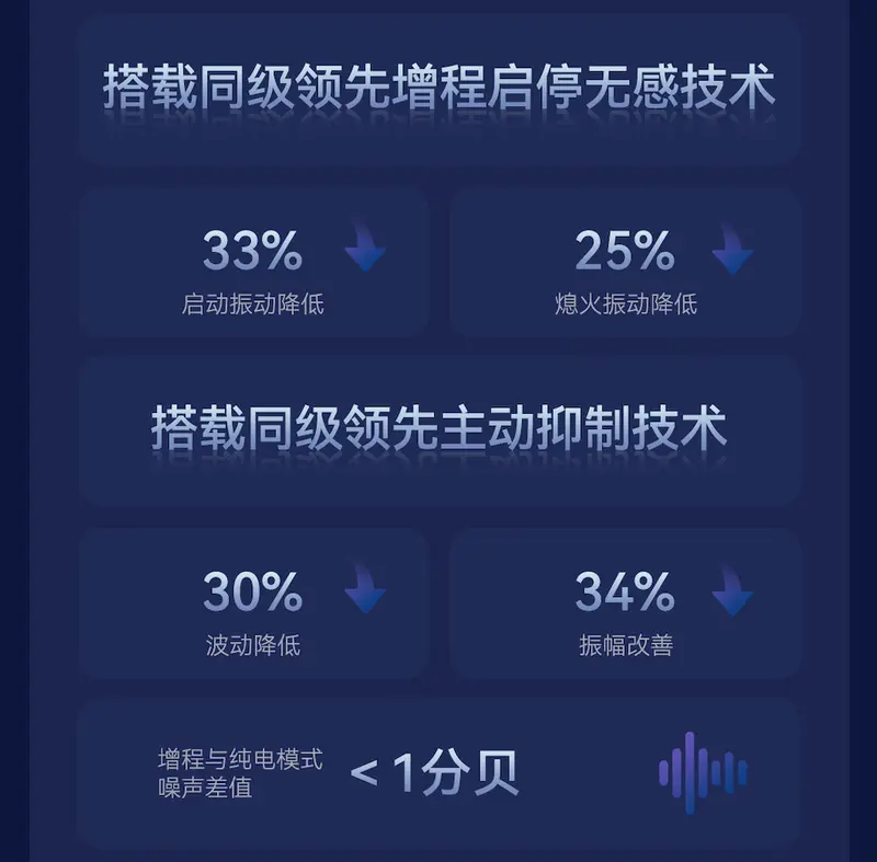 全新阿尔法T5增程版的北汽神擎增程,搭载增程启停无感技术,启动振动降低33%,熄火振动降低25%。采用同级领先主动抑制技术,波动降低30%,振幅改善34%,增程与纯电模式噪声差值 <1分贝。