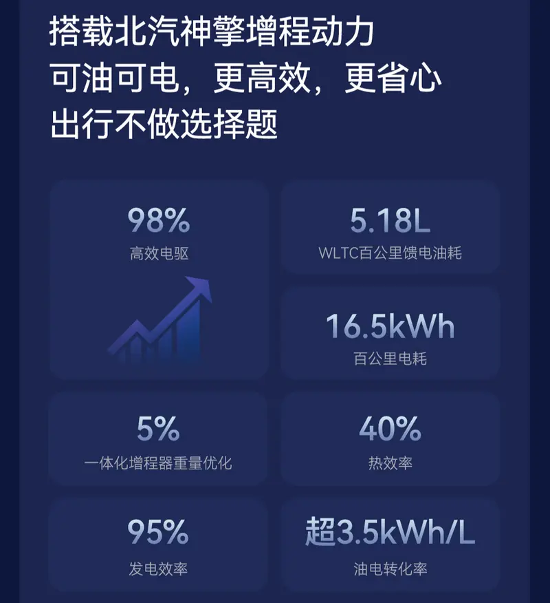 北汽神擎增程动力采用一体化集成设计整体减重5%,通过智能优化增程器工作模式与能量回收系统,热效率可达40%,发电效率高达95%,油电转化率超过3.5kWh/L,电驱效率高达98%,让全新阿尔法T5增程版WLTC百公里馈电油耗仅5.18L,百公里电耗16.5度。