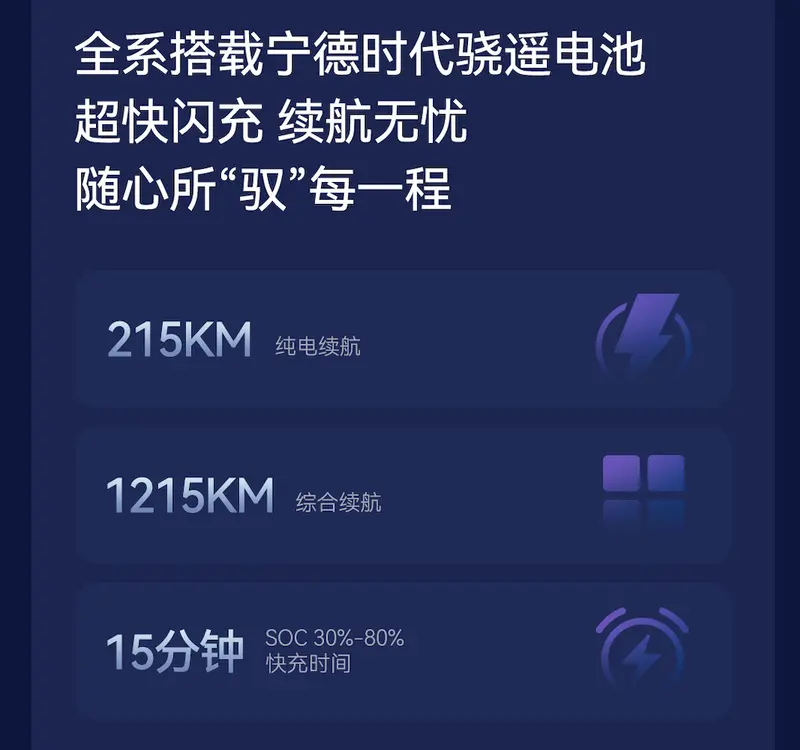 全新阿尔法T5增程版搭载的是宁德时代骁遥电池,这款电池专门为增程车型设计,CLTC纯电续航达到215km,综合续航高达1215公里,15分钟从30%充至80%。