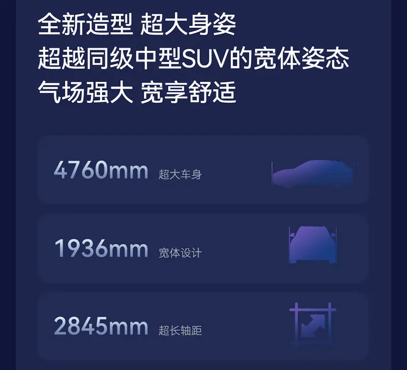 从官方释放的消息来看,极狐全新阿尔法T5整车尺寸为4760×1936×1650mm,轴距达2845mm,车长相比较现款增加70mm,是一款标准的中级SUV车型,整车线条、前脸和大灯造型,都更显年轻动感。