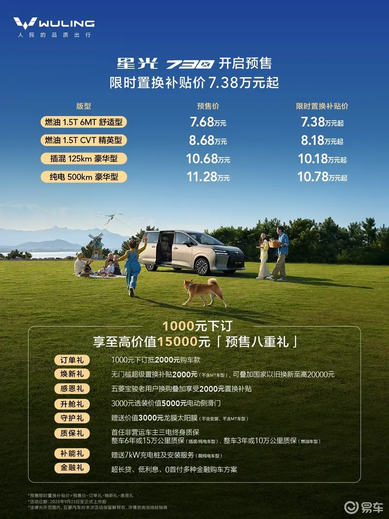 易车讯 10月15日,五菱星光730开启预售,包含四款车型,预售价区间7.68-11.28万元,限时置换补贴价区间7.38-10.78万元。