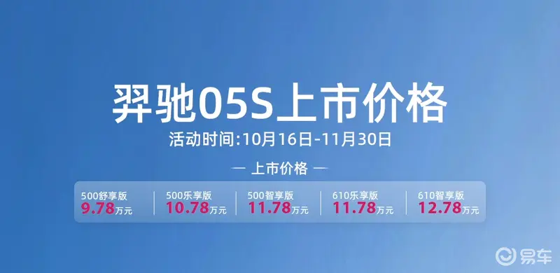 易车讯 10月16日,羿驰05S正式上市,新车共推出5款车型,售价9.78-12.78万元。新车定位为纯电动紧凑型SUV,续航里程为610km。