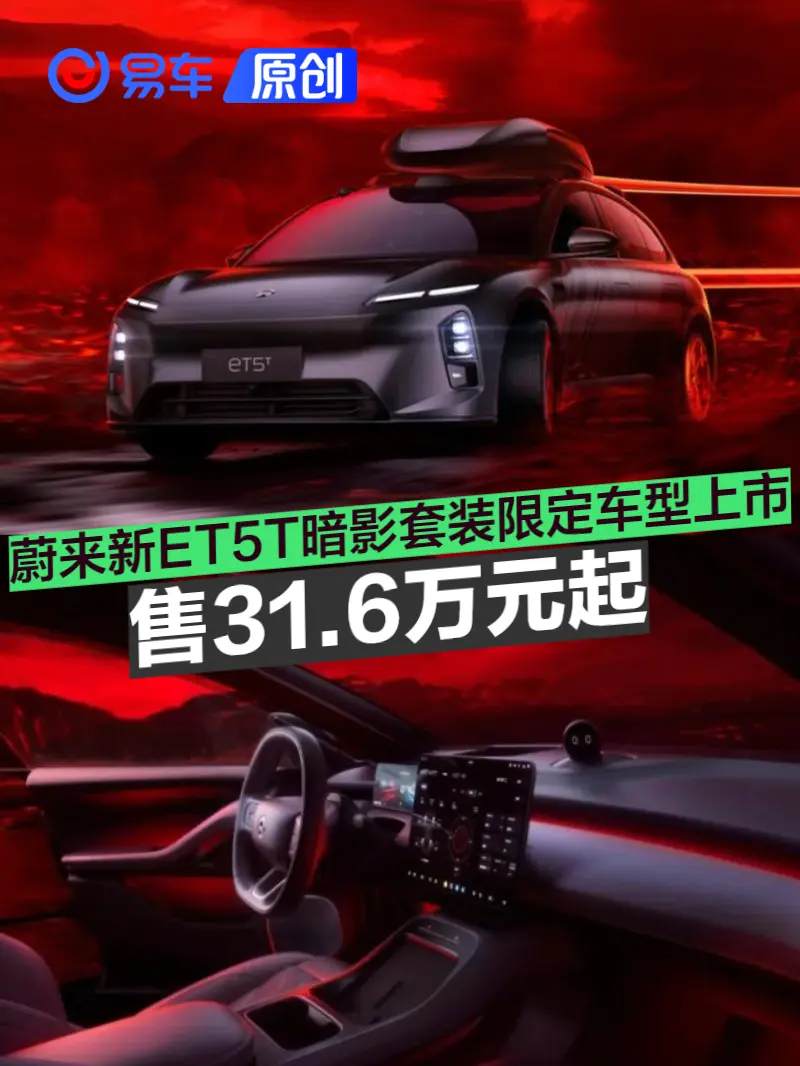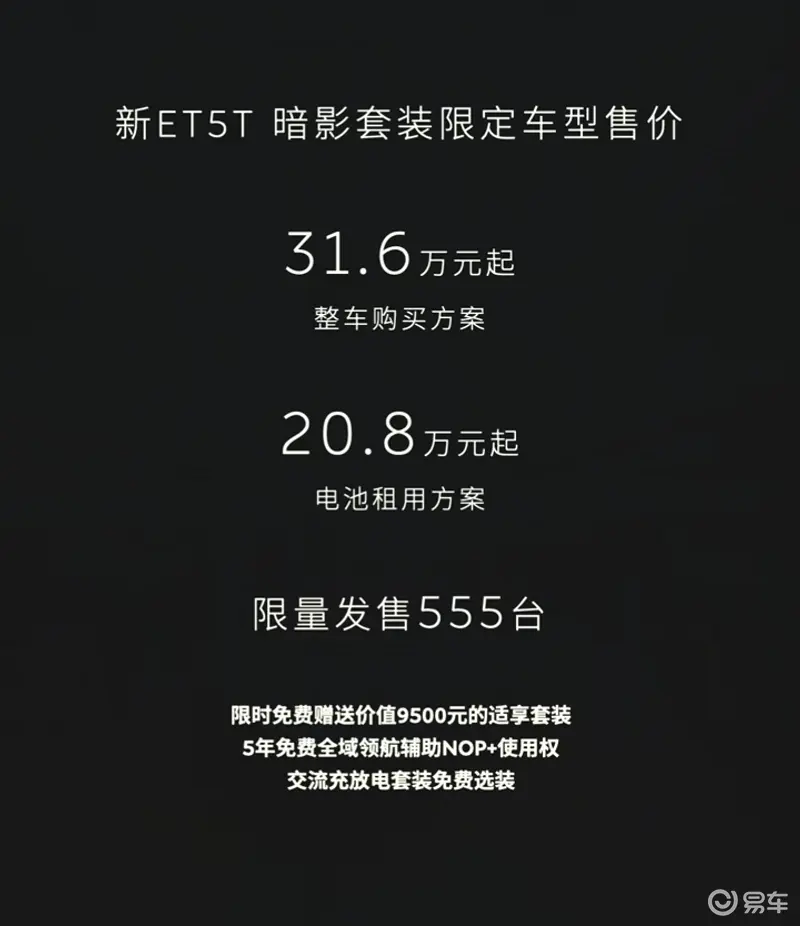 易车讯 10月17日,蔚来新ET5T暗影套装限定车型正式上市,整车购买方案售价31.6万元起,电池租用方案购买20.8万元起,限量发售555台。新车基于新ET5T升级而来,但采用了更具未来感的外观和内饰设计。同时,蔚来为新车推出限时权益,2025年10月31日(含)前锁单的用户,可免费选装交流充放电套装(或置换价值4,000元的选装基金),并可享5年NOP+免费使用权,以及获赠价值9,500元的适享套装。