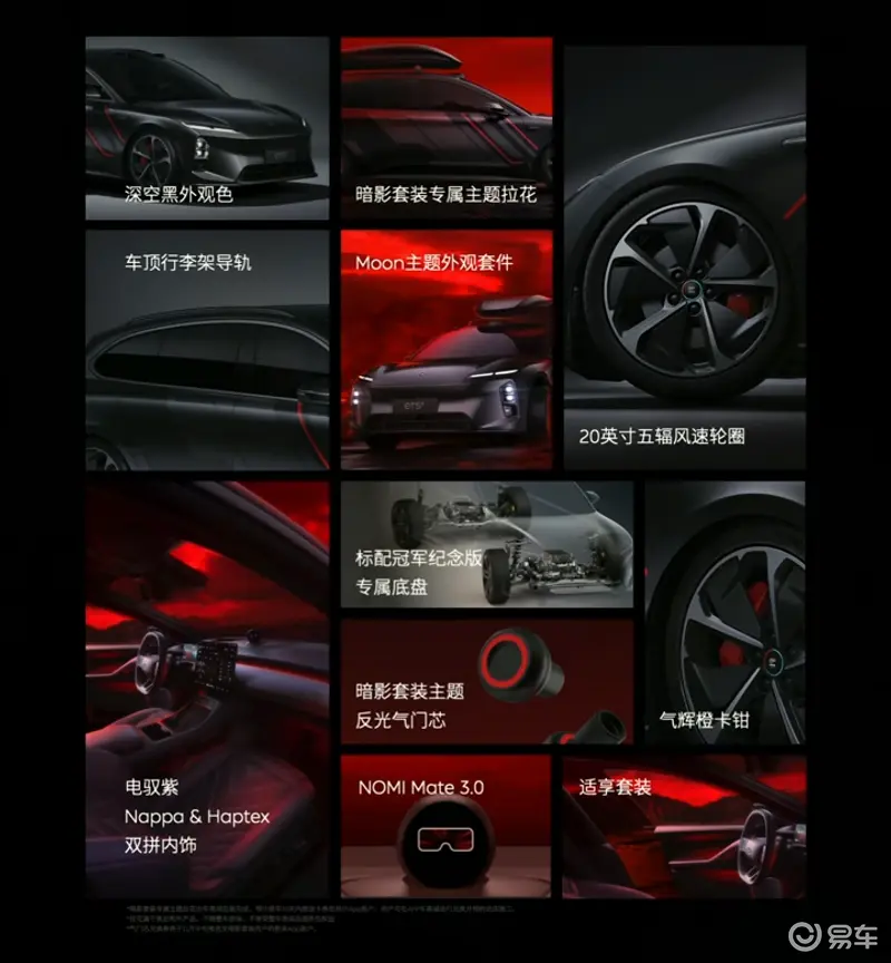 动力方面,蔚来新ET5T暗影套装限定车型搭载前感应异步后永磁同步双电机,电机总功率为490马力,峰值扭矩为700牛·米,并配备100kWh电池组,标配冠军纪念版专属底盘等。