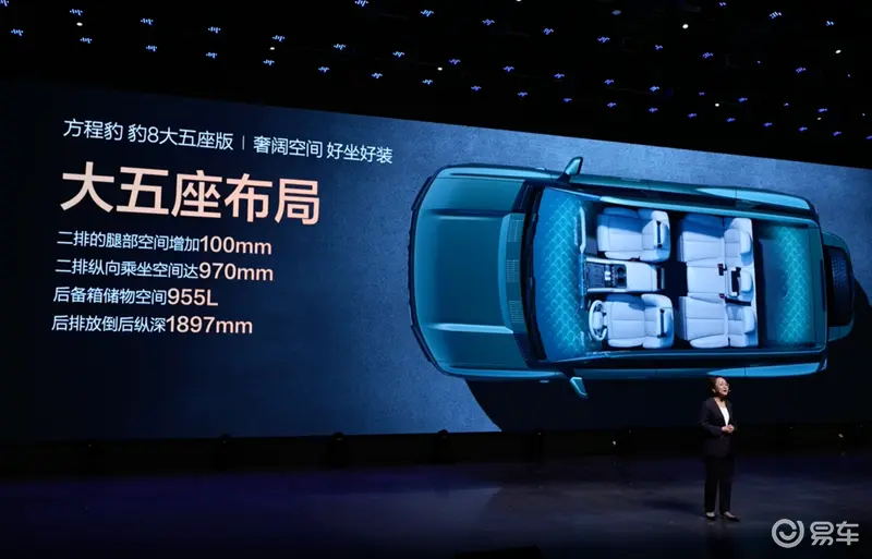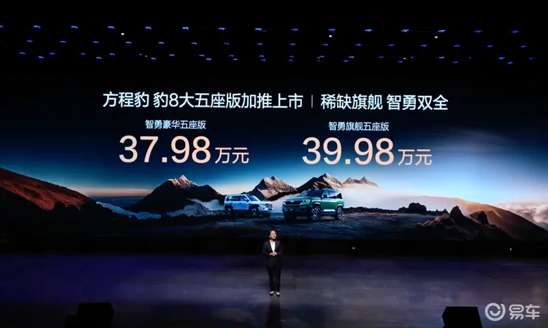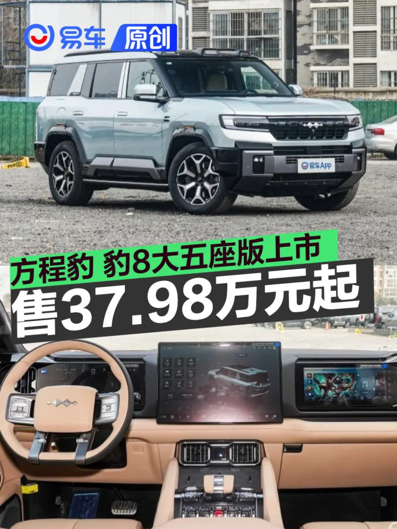 易车讯 10月20日,方程豹官方宣布,豹8大五座版车型正式上市,五座版共推出2款车型,售价37.98-39.98万元。豹8基于2.0T DMO平台打造,首发搭载全速域路面感知控制技术,华为乾崑智驾全面升级为ADS 4。