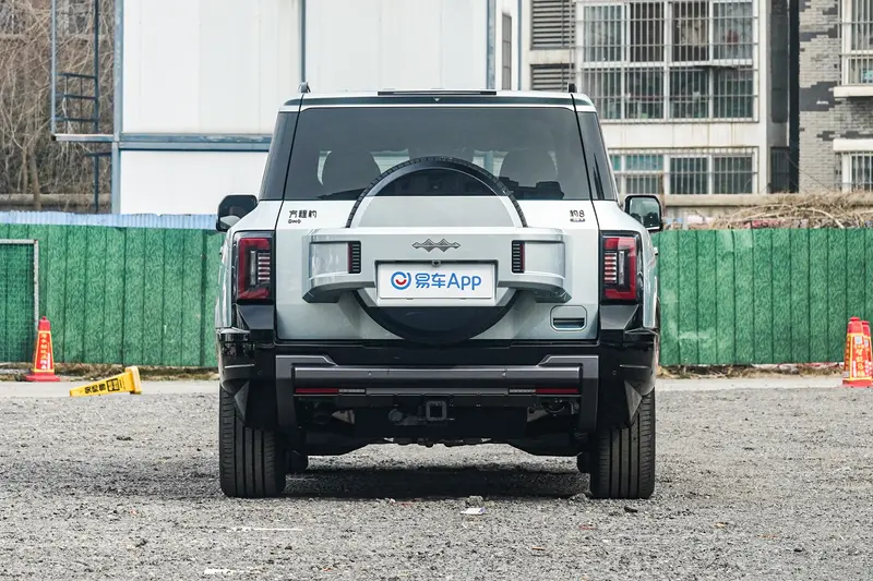车尾部分,豹8配备外挂的全尺寸备胎,尾门采用从右向左开启的侧开式设计,与一般的硬派SUV有所差异。类似中括号样式的尾灯组点亮后,非常亮眼,后包围则由大面积黑色材质组成,与前脸相呼应。