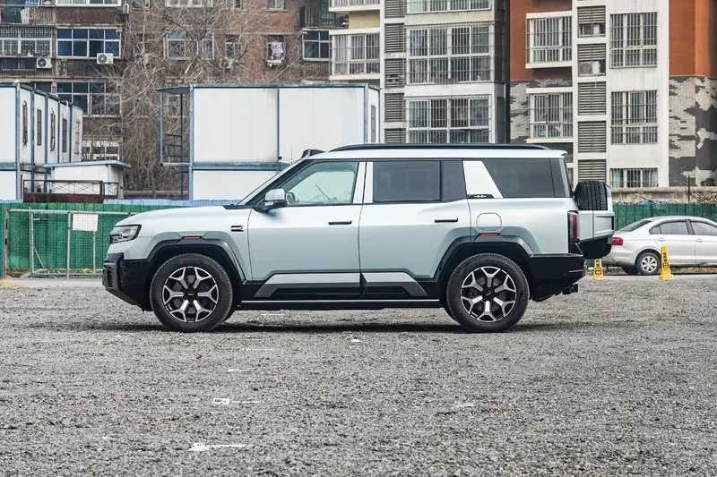 从侧面来看,豹8实车的方盒子造型也极具硬派SUV的气质,宽阔的黑色车身型面、强壮的车肩以及外壳造型硬朗的黑色后视镜,都尽显霸气的越野气息;另外,两侧前翼子板位置配有侧后向摄像头,车门下方还带有电动侧踏板。