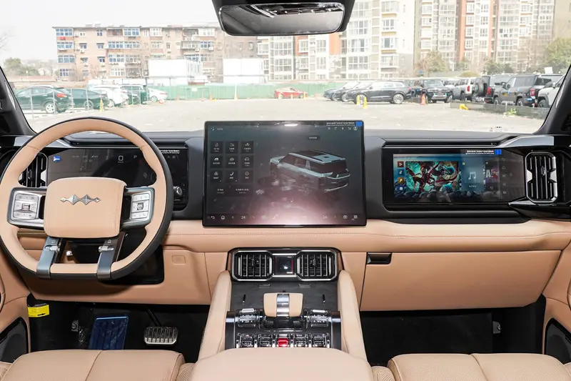 外观方面,豹8以“未来星舰美学”为设计理念,硬朗十足,发动机盖中央凹陷的线条、贯穿式LED灯等细节设计,进一步增强力量感,再加上接近5.2米的车长,实车看起来会更显气势,并新增“湖光绿”外观配色。新车标配20英寸多幅轮毂,可选装21英寸轮毂。