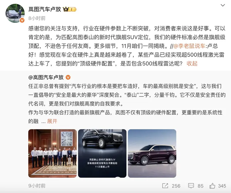 易车讯 10月21日,岚图汽车董事长卢放在回答网友提问岚图泰山会不会搭载500线激光雷达时表示,为匹配岚图泰山的新时代旗舰SUV定位,我们的硬件标准必然是旗舰级顶配,不逊色于任何友商。以此推测,岚图泰山很可能会搭载超500线激光雷达。