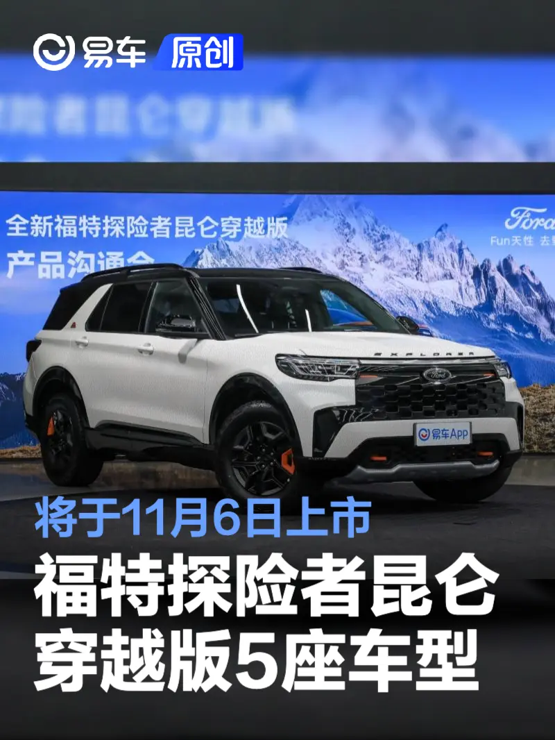 易车讯 我们从官方获悉,福特探险者昆仑穿越版(五座版)将于11月6日上市。新车整体设计与在售车型保持一致,采用2+3的五座布局,搭载2.3T发动机和四驱系统,标配机械式托森限滑差速器。