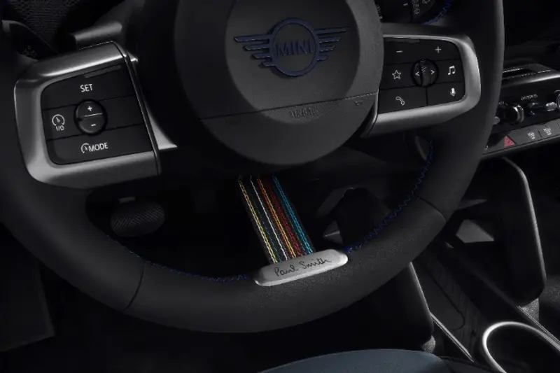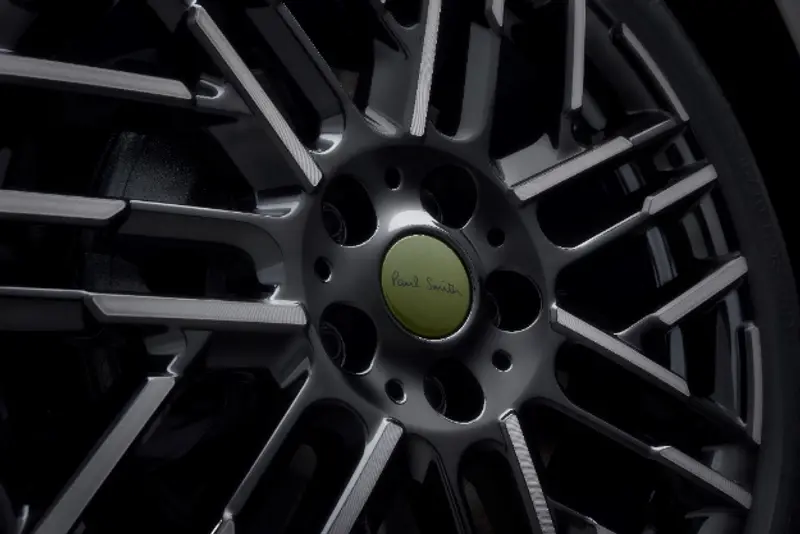 在诺丁汉绿车顶上,作为其核心设计元素的Paul Smith经典条纹,如点睛之笔恰到好处地装饰在驾驶员一侧;另一种亮黑色车顶版本则饰以粗细不一、兼具磨砂与光泽质感的Paul Smith暗调条纹,体现出低调的质感;MINI COOPER CABRIO PAUL SMITH 设计师款则标配黑色软顶。所有车型均配备18英寸幽影黑铝合金轮毂,采用碳钢灰色调的深色涂层。诺丁汉绿的轮毂盖上标有Paul Smith手写签名,车辆前后专属炭蓝色MINI标识与后备厢把手上的Paul Smith签名上下错落。