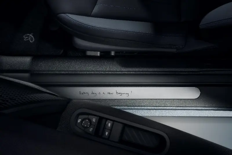 解锁车辆时,设计师手写体的“Hello”灯光投影映在地面,迎宾踏板上印有Paul Smith的座右铭“Every day is a new beginning”。Paul Smith还将他的“幸运符”手绘兔子图案悄悄画在驾驶位的地垫上。