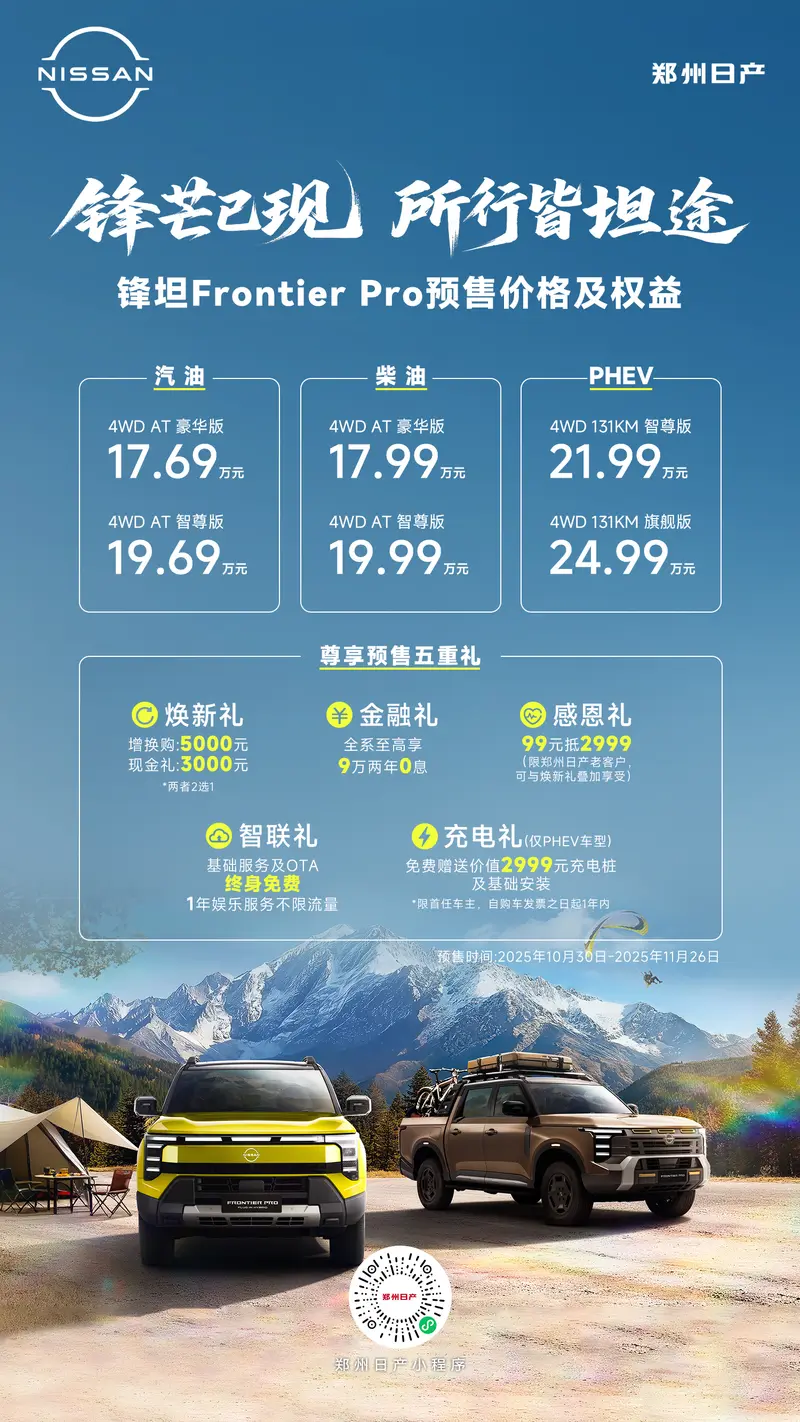 易车讯 10月30日,日产锋坦皮卡正式开启预售,新车共推出6款车型,预售价区间17.69-24.99万元。同时,官方推出尊享预售五重礼。新车是日产首款在中国设计、研发和生产的全球车型,采用日产全新的设计语言,将提供汽油、柴油以及插电混动三种动力。