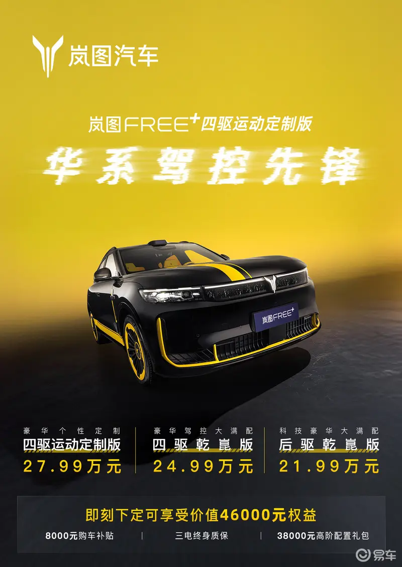 易车讯 10月30日,岚图汽车正式发布了岚图FREE+四驱运动定制版官图,该车此前已经上市,售价27.99万元。官方还表示即刻下定可享受价值46000元权益,包含8000元购车补贴、三电终身质保以及38000元高阶配置礼包。