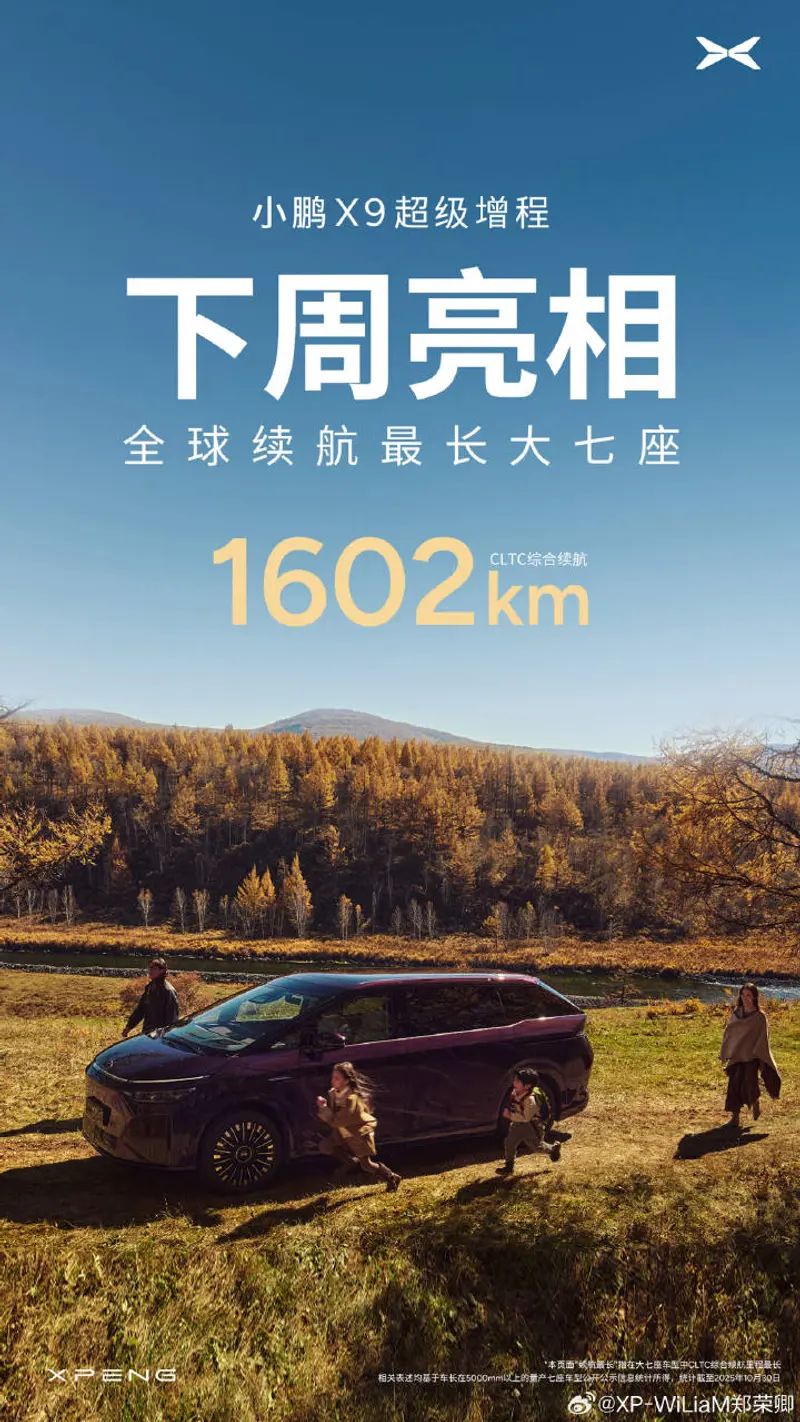 易车讯 10月31日,我们从官方获悉,小鹏X9超级增程下周正式亮相。同时,“63.3度超快充磷酸铁锂增程大电池”并将由小鹏X9超级增程车型搭载。