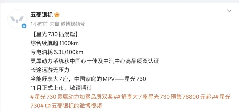 动力方面,五菱星光730汽油版搭载型号为LC4的1.5L发动机,最大功率130kW;插混版车型搭载型号为LBG的1.5L发动机,最大功率78kW,CLTC纯电续航125km,综合续航1100km。纯电版车型搭载单电机系统,最大功率100kW,配备60kWh神炼电池,CLTC续航500km,15分钟补能200km。