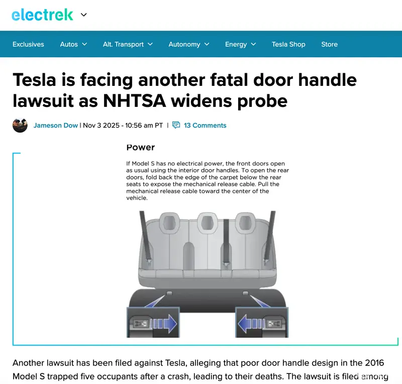目前,美国国家公路交通安全管理局(NHTSA)正就特斯拉车门存在的潜在安全缺陷展开调查,而NHTSA上周刚刚扩大了调查范围。