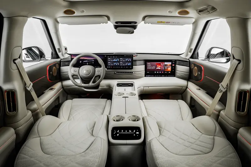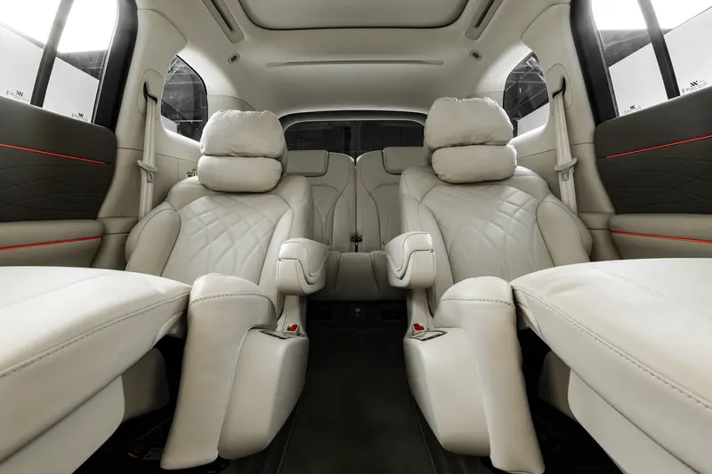 智己LS9采用2+2+2的六座布局,后排配备了21.5英寸车顶娱乐屏,第二排配备了独立座椅,并且还加入了腿托,座椅支持通风、加热以及按摩功能。值得一提的是,第二排座椅还可放平,进一步提升了内部乘坐空间。