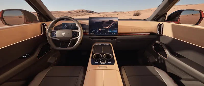 视觉交互方面,福特智趣烈马搭载同级最大的70英寸多功能AR-HUD(增强现实抬头显示系统)。该系统通过AR技术将导航箭头“投影”于实际道路,实现虚拟与现实的深度融合,让驾驶者视线不离路面即可获取关键行车信息。尤为独特的是,该系统业内首创越野信息显示模式,可在HUD界面实时呈现海拔、指南针、车辆姿态与俯仰角度预警等专属数据,将前挡风玻璃变为全景越野仪表盘。无论是城市复杂路况还是野外探索,这套AR-HUD系统都能有效提升驾驶专注度与行车安全性。