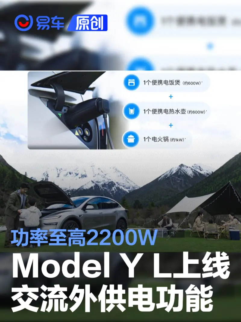 易车讯 11月10日,特斯拉宣布Model Y L上线交流外供电功能,功率至高2200W,可同时支持1个便携电饭煲(约600W)、1个便携电热水壶(约600W)、1个电火锅 (约1KW)。