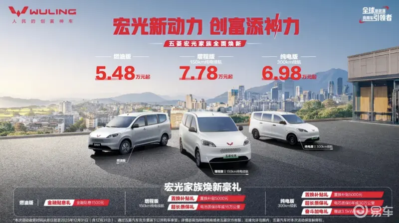 即日起至2025年12月31日,自官方渠道下订五菱宏光家族车型,享多重焕新豪礼,其中:燃油版享金融贴息礼1500元优惠;增程版与纯电版均享“置换补贴礼”,置换补贴5000元;同时提供“超长质保礼”,电池质保覆盖8年或16万公里(增程版)及电芯质保8年或30万公里(纯电版);纯电版用户更可享“奋斗加电礼”,加赠3.5kW充电桩(不含安装)。