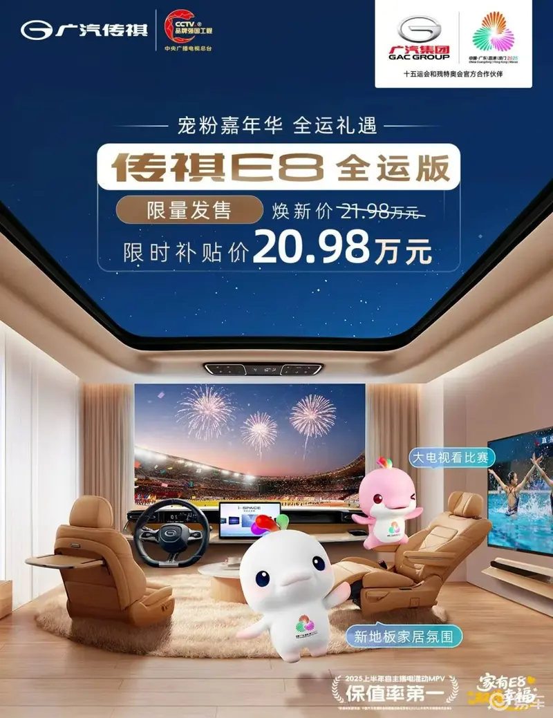 易车讯 11月10日,我们从官方获悉,传祺E8全运版正式上市,新车焕新价21.98万元,限时补贴价20.98万元。官方介绍,传祺E8全运版在MAX+版的基础上推出,进一步丰富了舒适性配置。