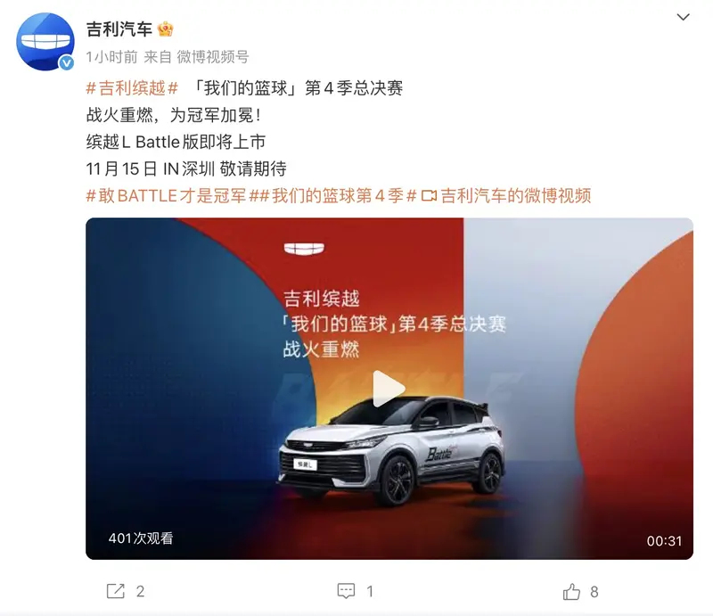 易车讯 11月11日,吉利汽车宣布缤越L Battle版将于11月15日正式上市。目前官方并未透露该车更多信息,作为新增车型,预计整体设计上不会有变化,可能会在配置和动力上进行调整升级。