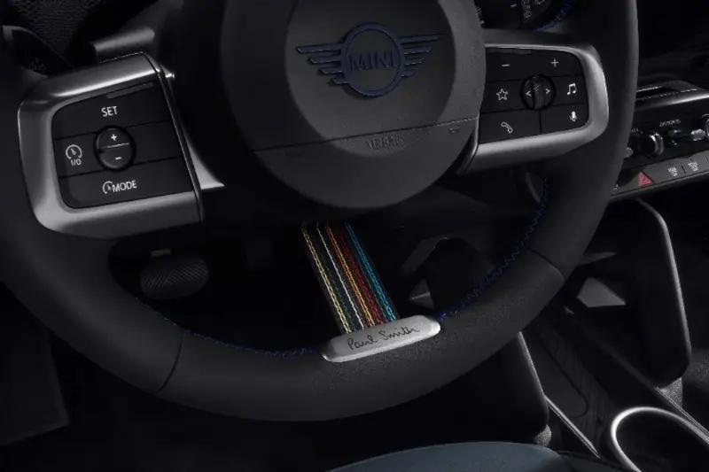 内饰方面,首先映入眼帘的是方向盘上一抹经典的Paul Smith彩色条纹织带和品牌铭牌。新车仪表台包裹了专属暗调条纹织物,此外还搭载了装饰有黑蓝双色织物和设计师签名的龙葵蓝Vescin运动座椅。MINI行业首创OLED 圆屏在个性化模式下,也新增了三种不同的Paul Smith专属背景。