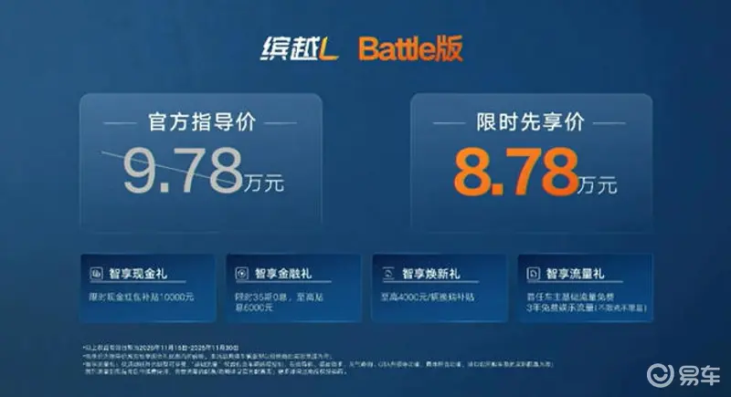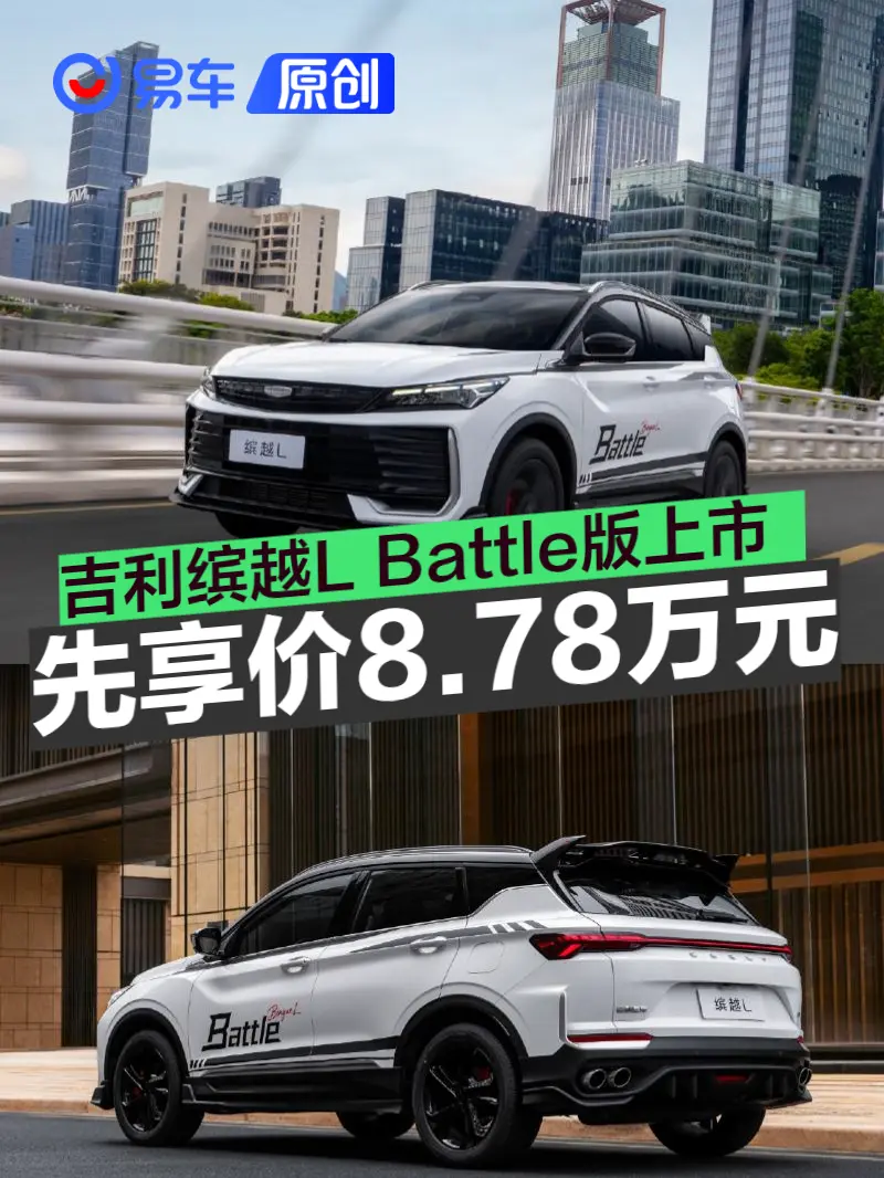 易车讯 11月15日,吉利缤越L Battle版正式上市,官方指导价9.78万元,限时先享价8.78万元。作为新增车型,缤越L Battle版整体设计基本延续在售车型,不过新增了全新碳纤维风格运动套件、麂皮环抱式运动座舱等内外饰设计。