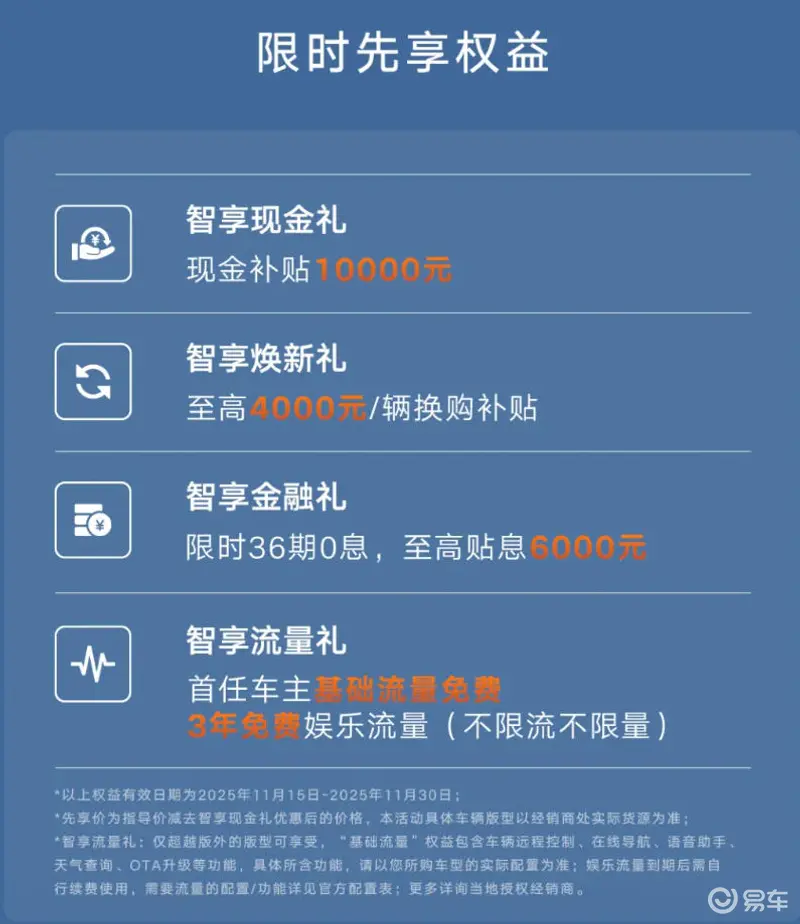 同时官方宣布,为回馈广大用户期待与支持,在11月30日前购买缤越L的用户,可享受,限时现金红包补贴10000元;限时36期0息,至高贴息6000元;至高4000元/辆换购补贴;首任车主基础流量免费,3年免费娱乐流量(不限流不限量)等四重权益。