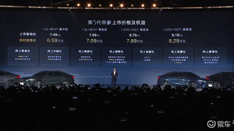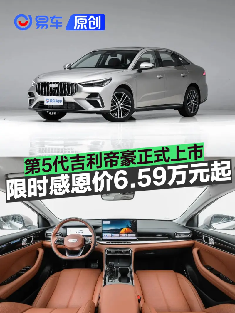 易车讯 11月18日,第5代吉利帝豪正式上市,新车共推出4款配置,上市指导价7.49-9.19万元,同时官方推出限时活动,限时感恩价6.59-8.29万元。第5代帝豪依然定位紧凑型车,搭载1.5T+7DCT与1.5L+CVT(模拟8速)两套动力总成。