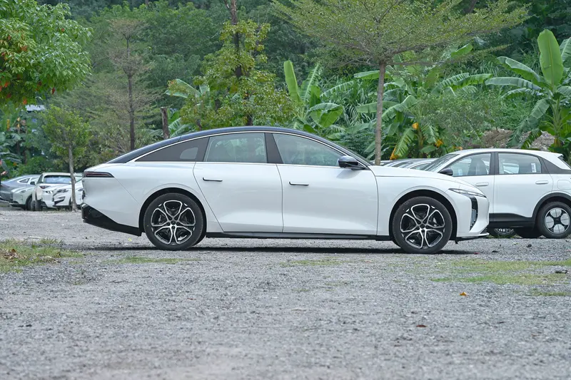 车身侧面,新车整体车身面板均采用了较为平整光滑的曲面设计,配备了无边框车门,并搭配了隐藏式门把手,整车风阻系数为0.191Cd。尾部方面,新车配备了贯穿式的尾灯组,点亮后极具辨识度。