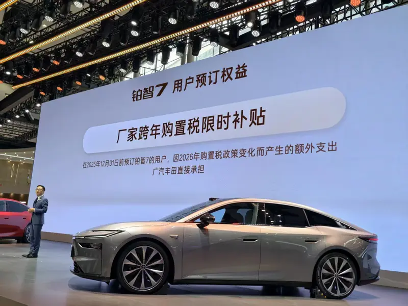 易车讯 在11月21日开幕的2025广州车展上,广汽丰田铂智7内饰迎来正式发布,并同步开启预定。官方推出厂家跨年购置税限时补贴,在2025年12月31日前预订铂智7的用户,因2026年购置税政策变化而产生的额外支出广汽丰田将直接承担。新车定位中大型纯电轿车,并配备华为鸿蒙座舱。同时,官方表示,即将推出增程版的汉兰达和赛那车型。
