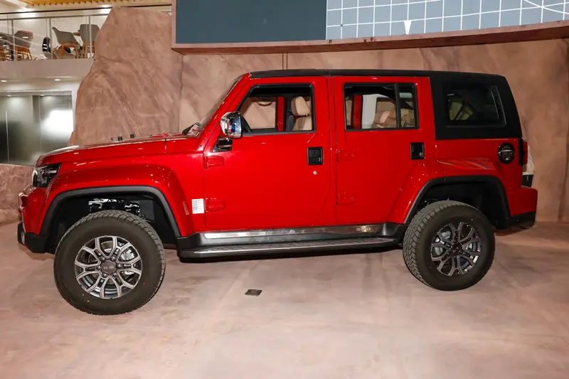 外观方面,外观方面,新车沿用了老款车型设计,并采用了经典的红色车漆。前脸经典的五孔状前格栅非常具有辨识度,整体造型方正,突出了其硬派属性,直棱直角的设计也使得车内空间更加充裕。