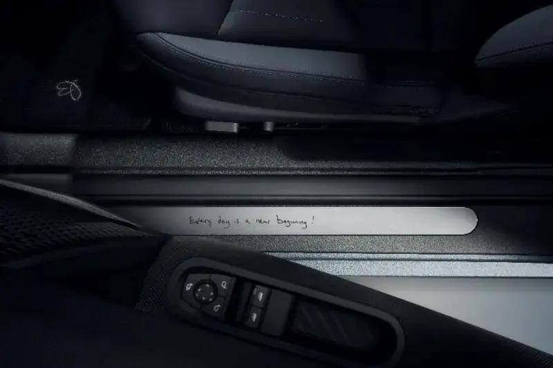 解锁车辆时,设计师手写体的“Hello”灯光投影映在地面,迎宾踏板上印有Paul Smith的座右铭“Every day is a new beginning”。Paul Smith还将他的“幸运符”手绘兔子图案悄悄画在驾驶位的地垫上。
