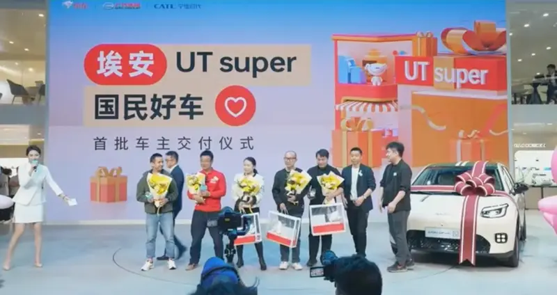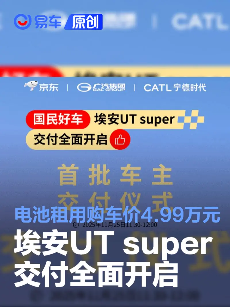 易车讯 11月25日,广汽埃安今日官方宣布,由京东、广汽集团、宁德时代联合推出的埃安UT super交付全面开启,首批车主交付仪式在广州车展广汽埃安展台举行。新车搭载“广汽华为云车机”技术,配备 500km 续航大电池,支持99秒换电,电池租用购车价4.99万元,整车购买价8.99万元。