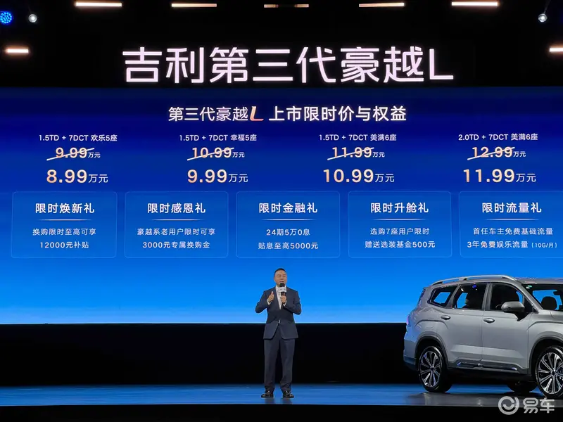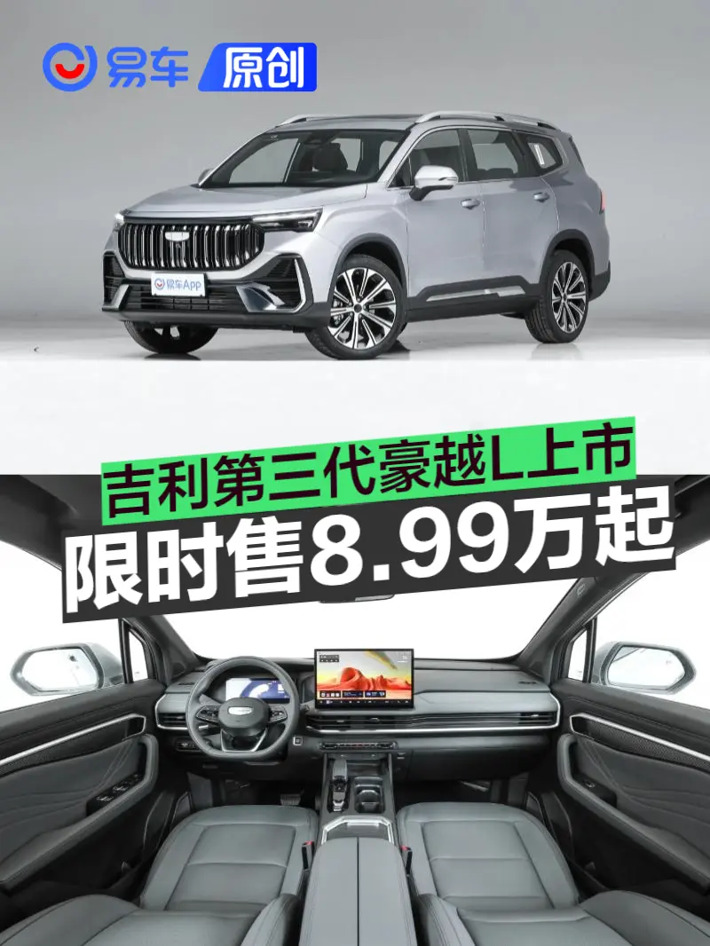 易车讯 11月27日,吉利第三代豪越L正式上市,包含四款车型,官方指导价区间9.99-12.99万元,此外上市限时享交1000元抵11000元购车金,优惠后限时权益价区间8.99-11.99万元。新车采用最新的家族设计语言,并在配置和空间上进行了全面升级革新。动力方面在保留2.0T发动机的基础上新增1.5T版本。