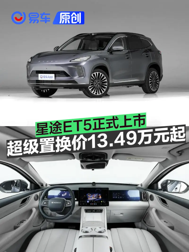 易车讯 11月28日,星途ET5正式上市,共2款配置,上市指导价14.49万元-15.99万元,另外官方推出优惠活动,超级置换价13.49-14.99万元,以及五大购车权益和三大基础权益。星途ET5是一款中型SUV,采用增程式的动力形式,并且会首搭地平线HSD和征程6P。