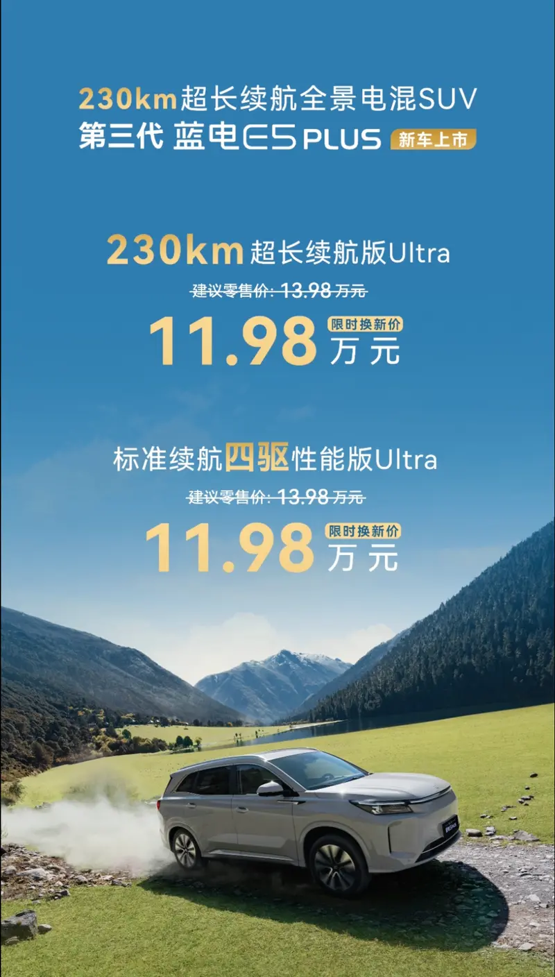 易车讯 12月3日,我们从官方获悉,第三代蓝电E5 PLUS正式上市,新车共推出2款车型,售价13.98万元,限时换新价11.98万元。新车在外观、续航、动力与智能化等方面升级,新车采用插混动力,纯电续航达到230km。