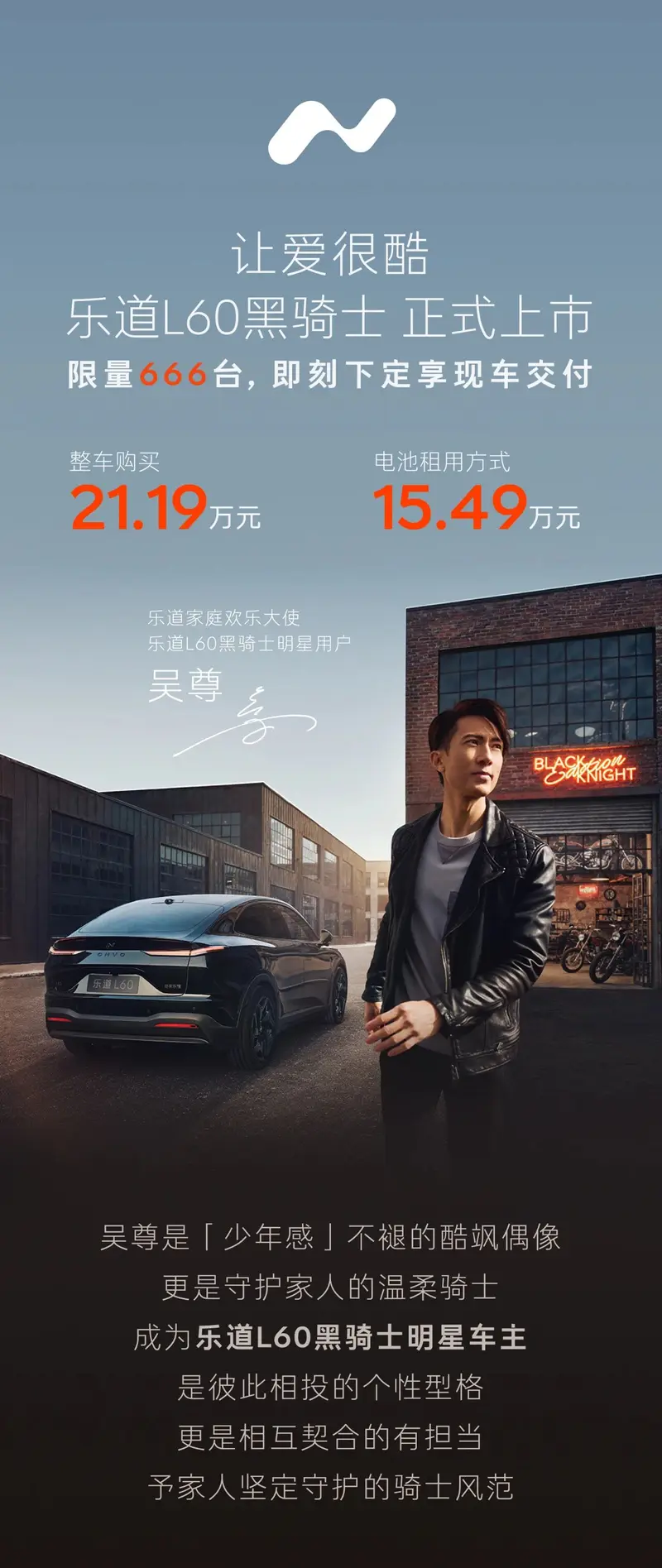 易车讯 12月5日,乐道汽车官方宣布L60黑骑士迎来正式上市,整车购买方案售价21.19万元,电池租用方案售价15.49万元。新车限量666台,即刻下定可享受现车交付。