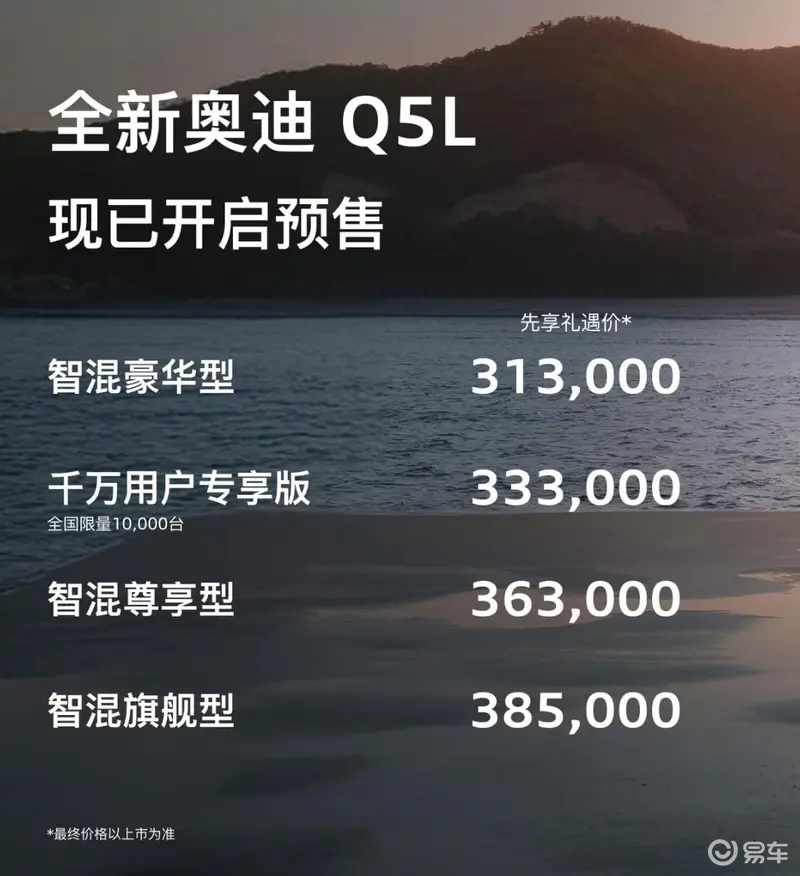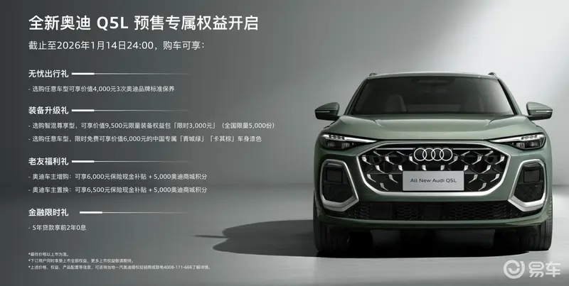 易车讯 我们从官方渠道获悉,全新奥迪Q5L现已开启预售,先享礼遇价31.3-38.5万元,预计2026年1月上市。据悉,全新奥迪Q5L基于全新PPC豪华燃油车平台打造,内外全面焕新,并配备华为乾崑辅助驾驶系统。