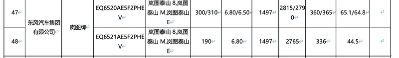 易车讯 在工信部发布的最新一期《减免车辆购置税的新能源汽车车型目录》中,我们看到了岚图全新SUV车型的纯电续航信息,该车搭载一套1.5T插电混动系统,提供190km、300km以及310km三种纯电续航。该车曾在本月初完成了工信部申报,从尾部标识来看,该车或被定名为泰山8(选装字标中还出现了泰山E、泰山M的尾标)。