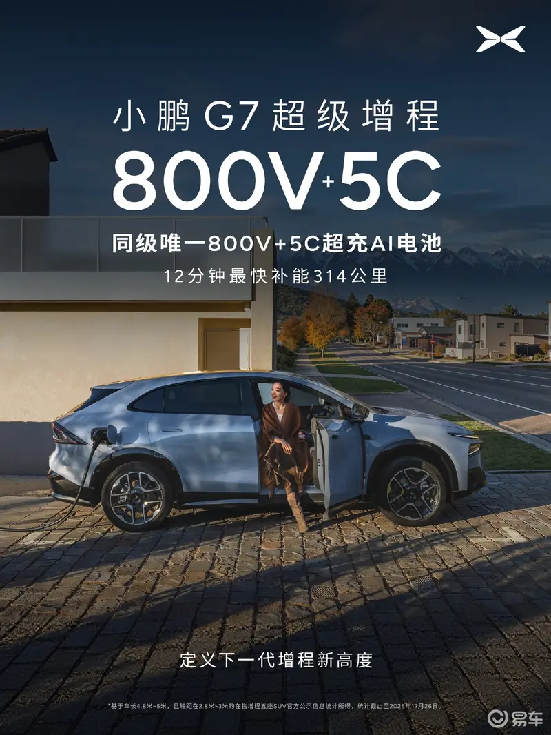 易车讯 12月30日,小鹏汽车正式发布G7超级增程更多官图,并随之公布了新车的动力信息。该车拥有430公里纯电续航以及1704公里综合续航,搭载800V+5C超充AI电池,12分钟充电314公里。官方此前已经宣布,小鹏G7超级增程将于2026年一季度上市。
