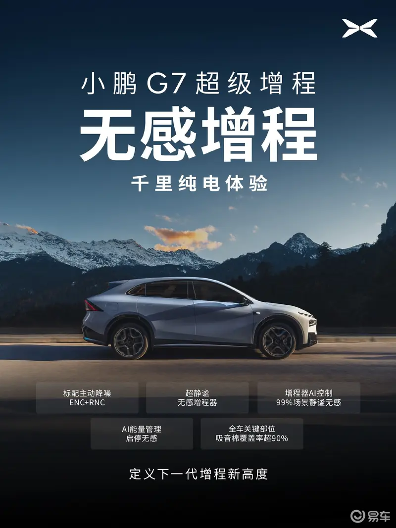 此外,小鹏G7超级增程还标配ENC+RNC双主动降噪 ,配备增程器AI管理,90%关键部位吸音棉覆盖,99%场景静谧无感。