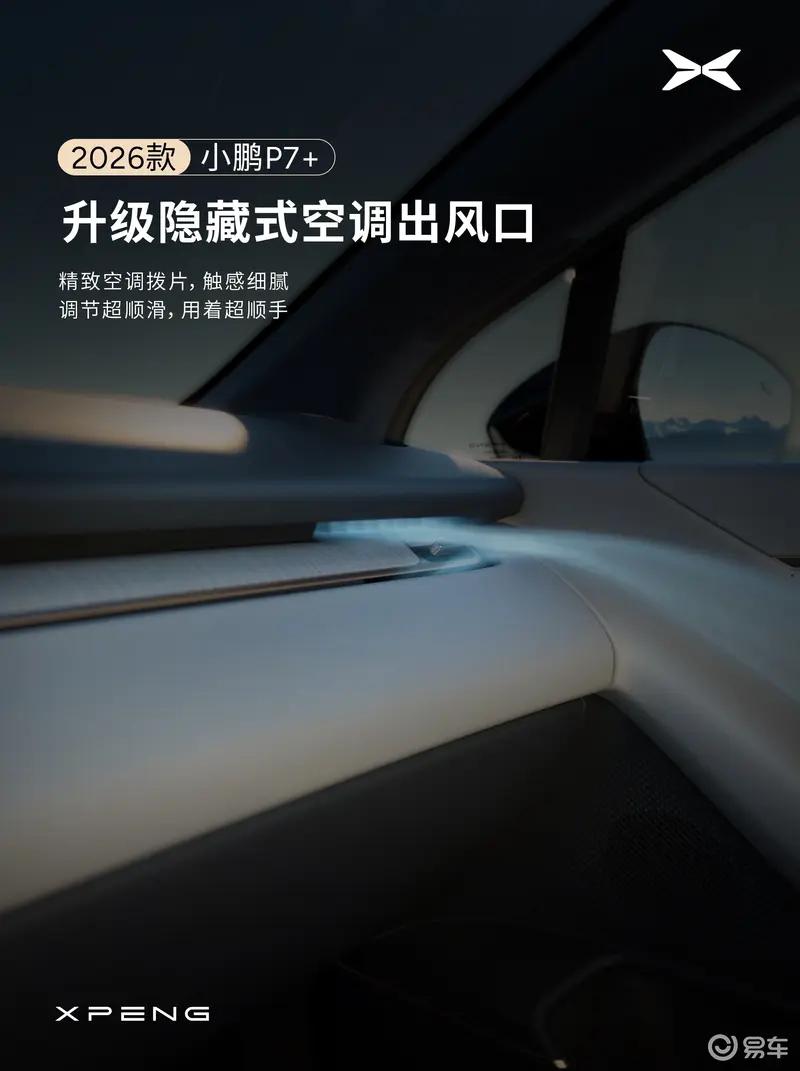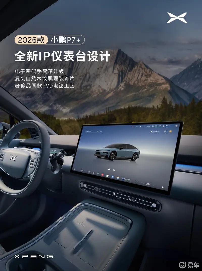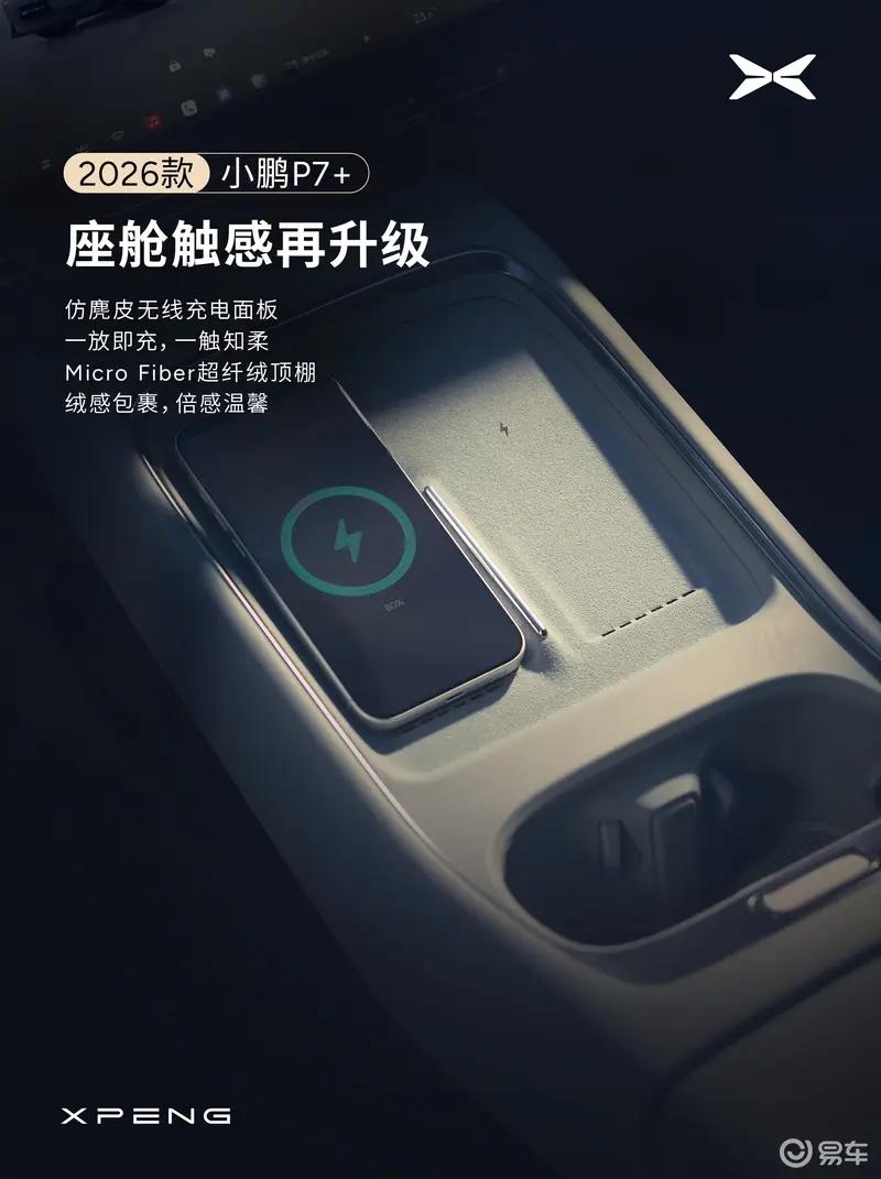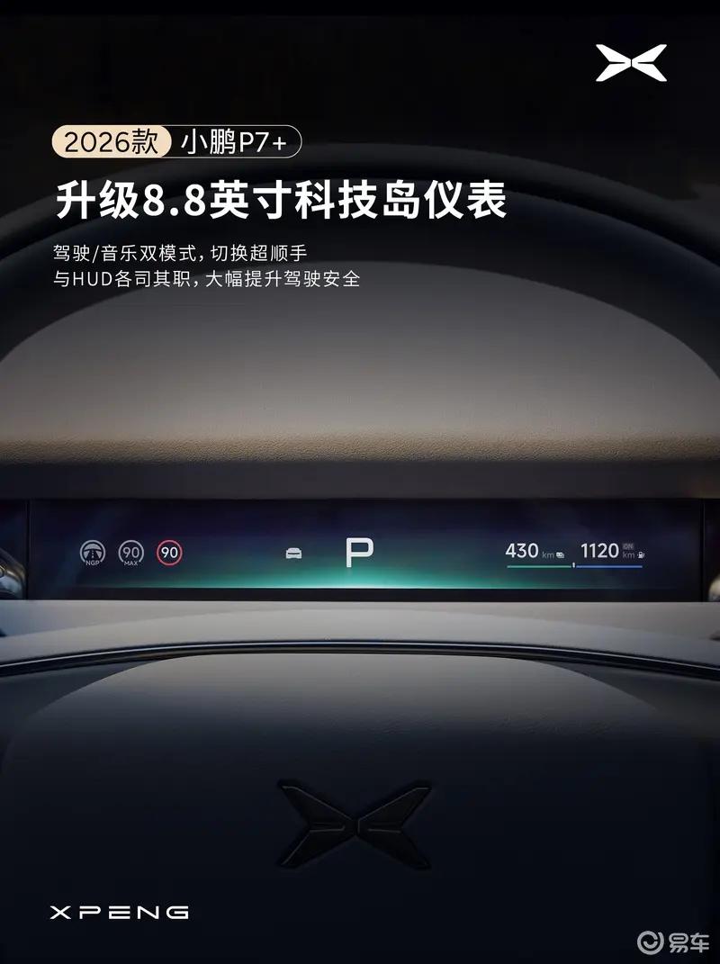 内饰方面,2026款小鹏P7+整体设计基本延续在售车型,但新增了柔光紫和晨雾蓝内饰配色。此外,新车主要变化是配置上的升级,包括升级为8.8英寸仪表,新增29英寸HUD、隐藏式空调出风口、星瀑式氛围灯、仿麂皮无线充电面板、Micro Fiber超纤绒顶棚以及电子密码手套箱等。