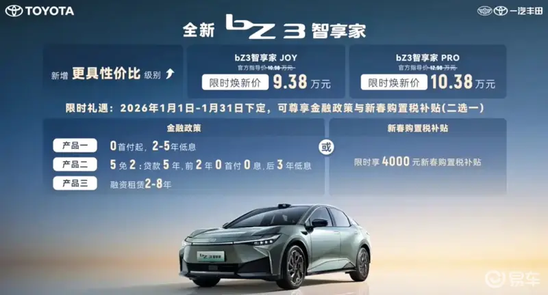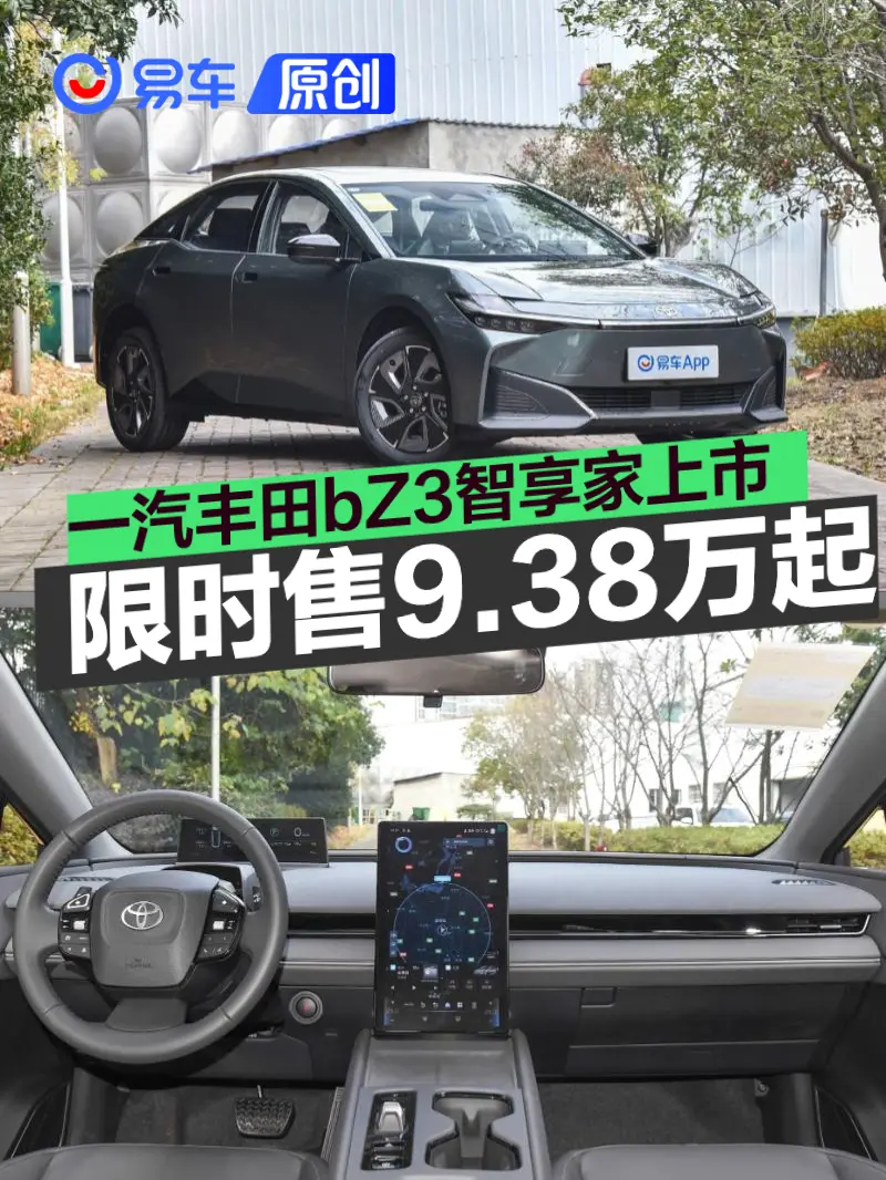 易车讯 12月31日,一汽丰田bZ3智享家正式上市,包含两款车型,售价区间10.98-12.98万元,限时焕新价9.38-10.38万元。